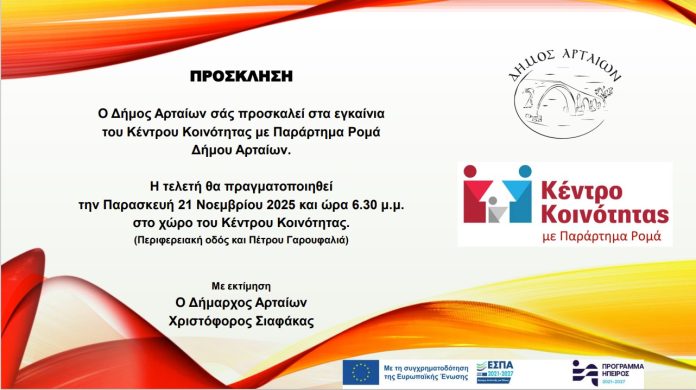Ο Δήμος Αρταίων ανακοινώνει ότι τα εγκαίνια του Διευρυμένου Κέντρου Κοινότητας με Παράρτημα Ρομά θα πραγματοποιηθούν την Παρασκευή 21 Νοεμβρίου και ώρα 6:30 μμ στις εγκαταστάσεις του Κέντρου, στη συμβολή των οδών Περιφερειακής Οδού και Πέτρου Γαρουφαλιά (πρώην κτήριο της Alpha Bank).