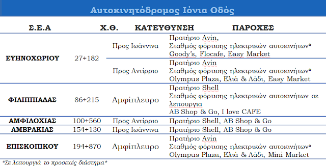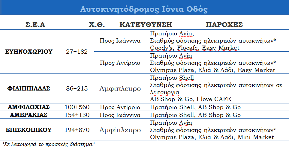 Παρακάτω, ακολουθεί αναλυτικός πίνακας με τις παρεχόμενες υπηρεσίες των νέων «πράσινων» Σ.Ε.Α. στην Ιόνια Οδό:
